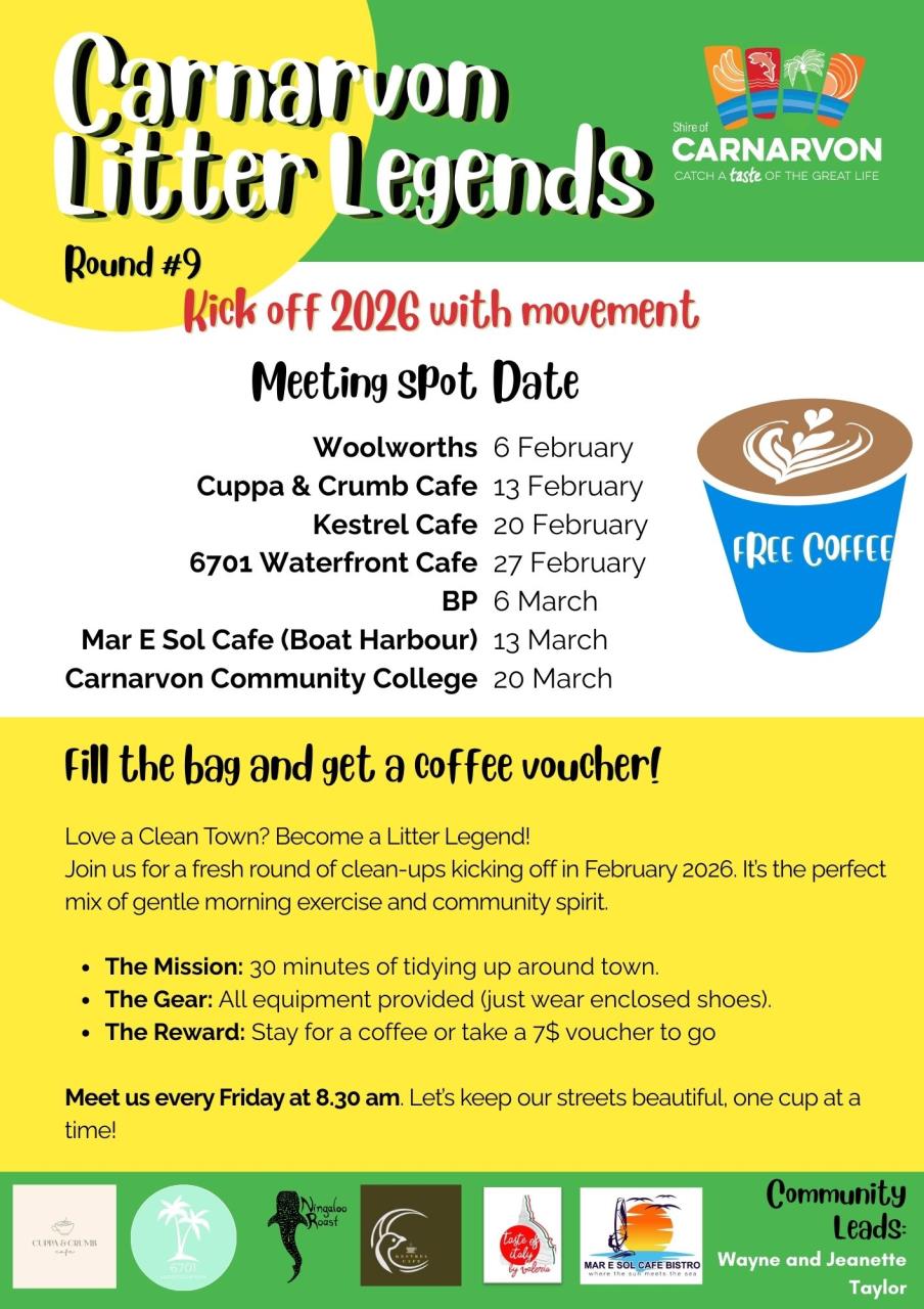 It's the fun, feel-good way to keep our beautiful Carnarvon clean! Join our friendly Litter Legends and reward yourself with a FREE coffee.