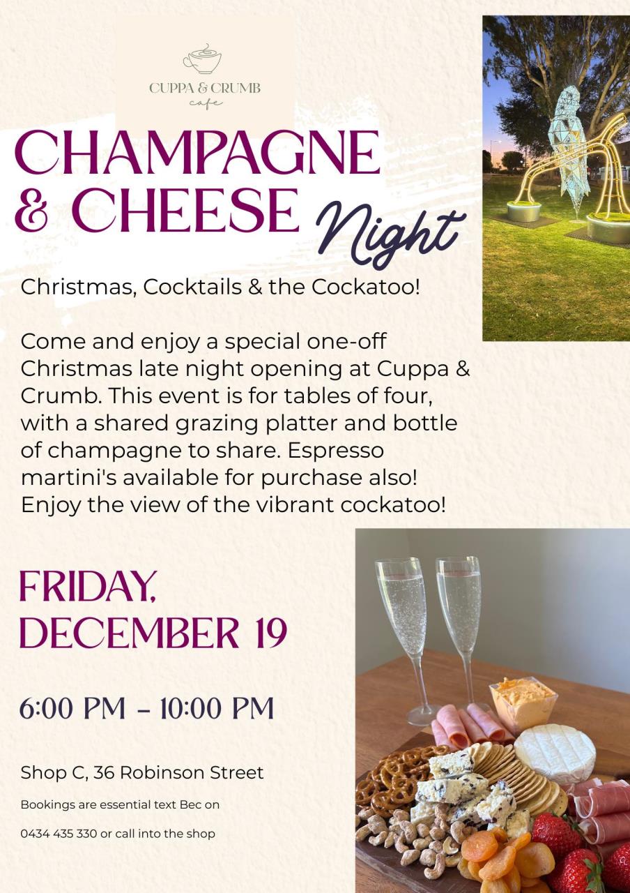 Come and enjoy a special Christmas late night opening at Cuppa & Crumb. This Event is for tables of four, with a shared grazing platter and bottle of champagne to share. Expresso Martini's available for purchase also!