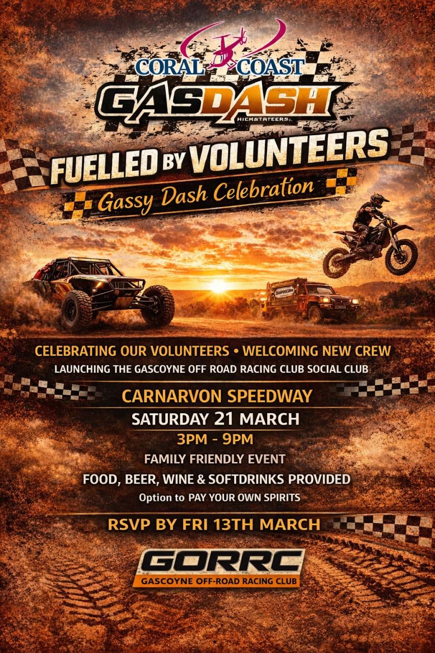 The Gascoyne Off-Road Racing Club invites you to join us for the Fuelled by Volunteers – Gassy Dash Celebration!