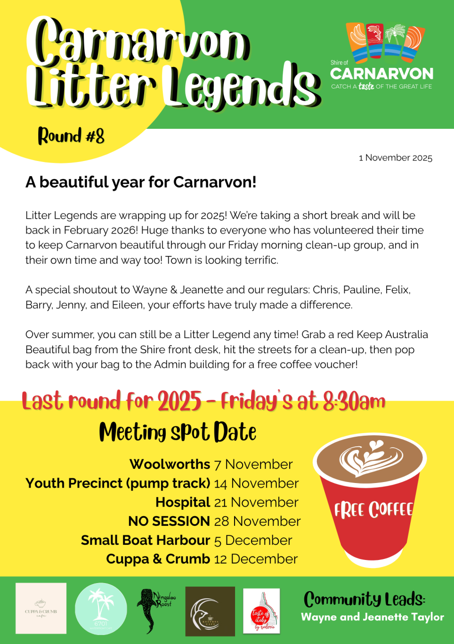 A special shoutout to Carnarvon Litter Legends community leads: Wayne & Jeanette, and also to the groups regulars Chris, Pauline, Felix, Barry, Jenny, and Eileen! Huge thanks to everyone who’s helped keep Carnarvon beautiful, whether you joined our Friday morning clean-ups or took time out on your own. The town is looking terrific thanks to the efforts of many hands doing their part, along with our hard-working Shire depot team ⭐
