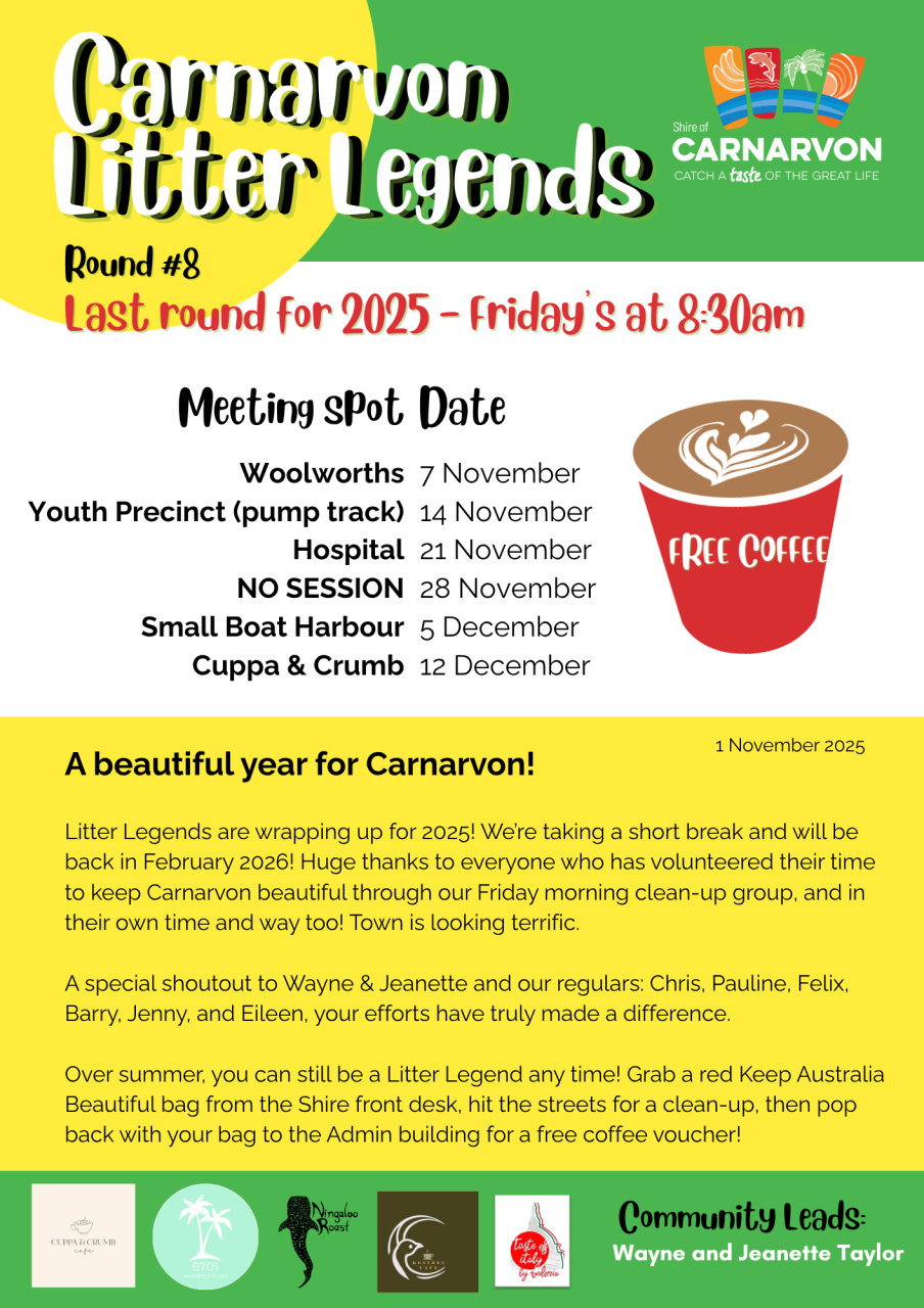You can still be a Litter Legend over summer! Pick up a red Keep Australia Beautiful bag from the Shire of Carnarvon front desk, head out for your own mini clean-up, then drop your bag at the Shire Admin Building to claim a free coffee voucher as a thank you.