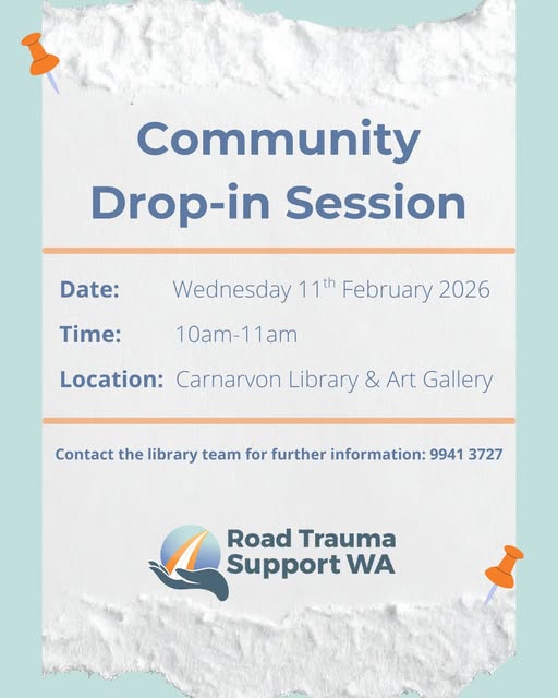 The Road Trauma Support WA team will be at the Carnarvon Library & Art Gallery for a drop-in session.