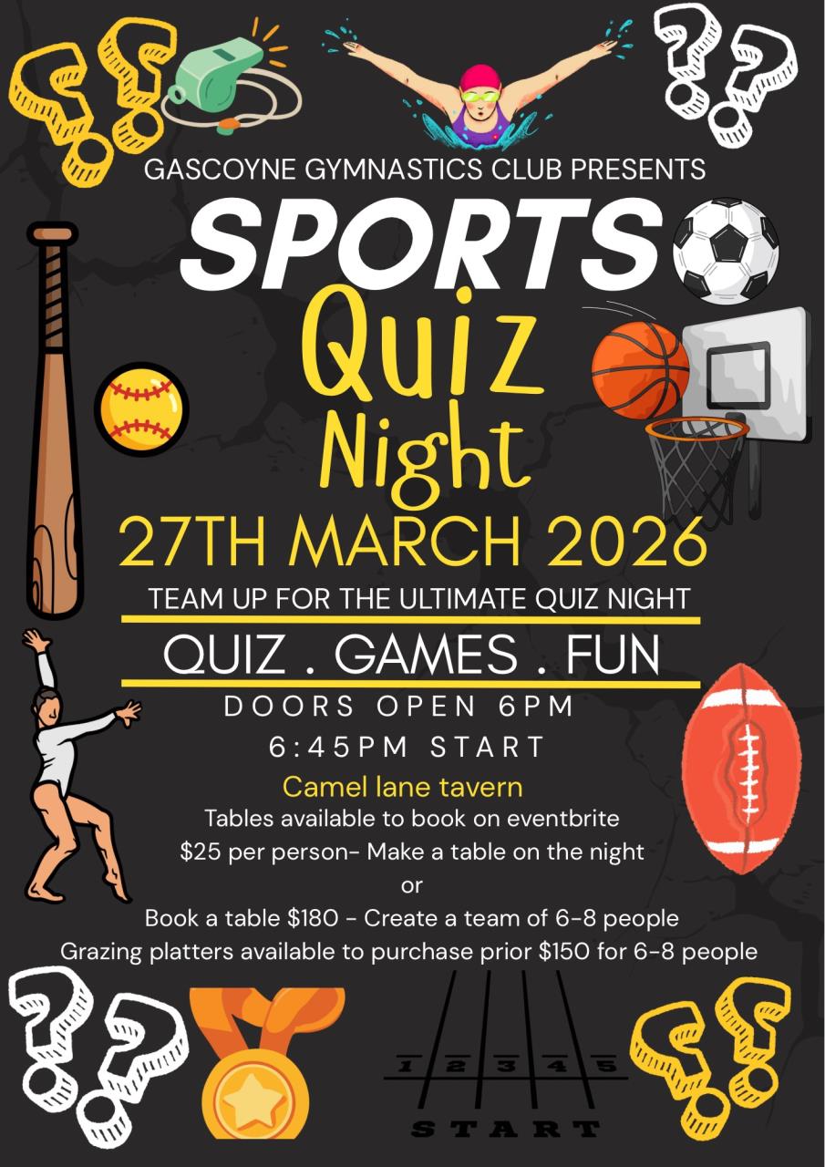 Gascoyne Gymnastics Club is hosting a Sports Quiz Night and they’d love your support!