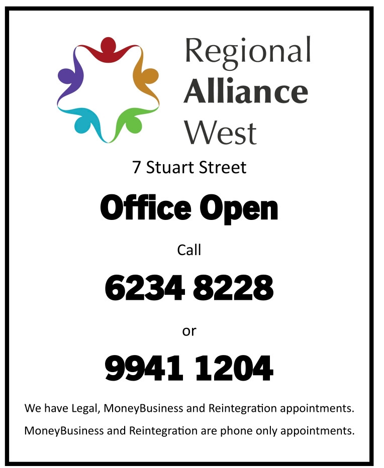 Directory Listing for Regional Alliance West Business +61 8 6234 8228 9941 1204 admin@raw.org.au raw.org.au 7 Stuart Street Carnarvon 6701 For Legal, MoneyBusiness and Reintegration appointments.MoneyBusiness and Reintegration are phone only appointments. Images Regional Alliance West