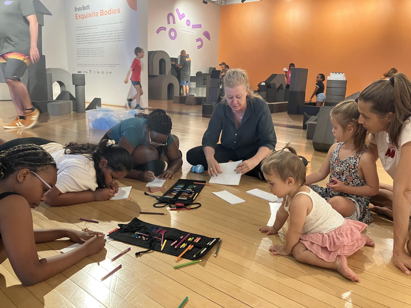 The school holiday session for kids was immensely popular, with young artists having heaps of fun building with blocks and crafting the most amazing Exquisite Corpse drawings, those collaborative, surreal masterpieces that blend drawings into whimsical figures. A special Friday Night Art Club added to the excitement, held right in the Exquisite Bodies area. Participants moved and danced under the guidance of Lisa Coles, creating a lively evening of expression and connection.