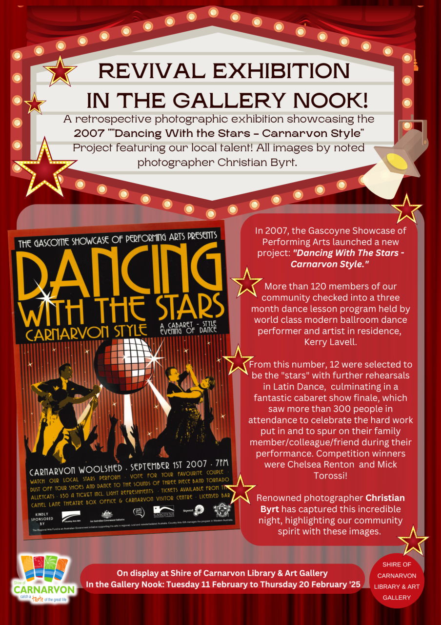 Focusing on the "Dancing With The Stars - Carnarvon Style" project, the exhibition told the story of how a community came together under the guidance of world-class performer Kerry Lavell. From the initial 120 participants to the final 12 "stars," photographer Christian Byrt captured every step, spin, and dip.