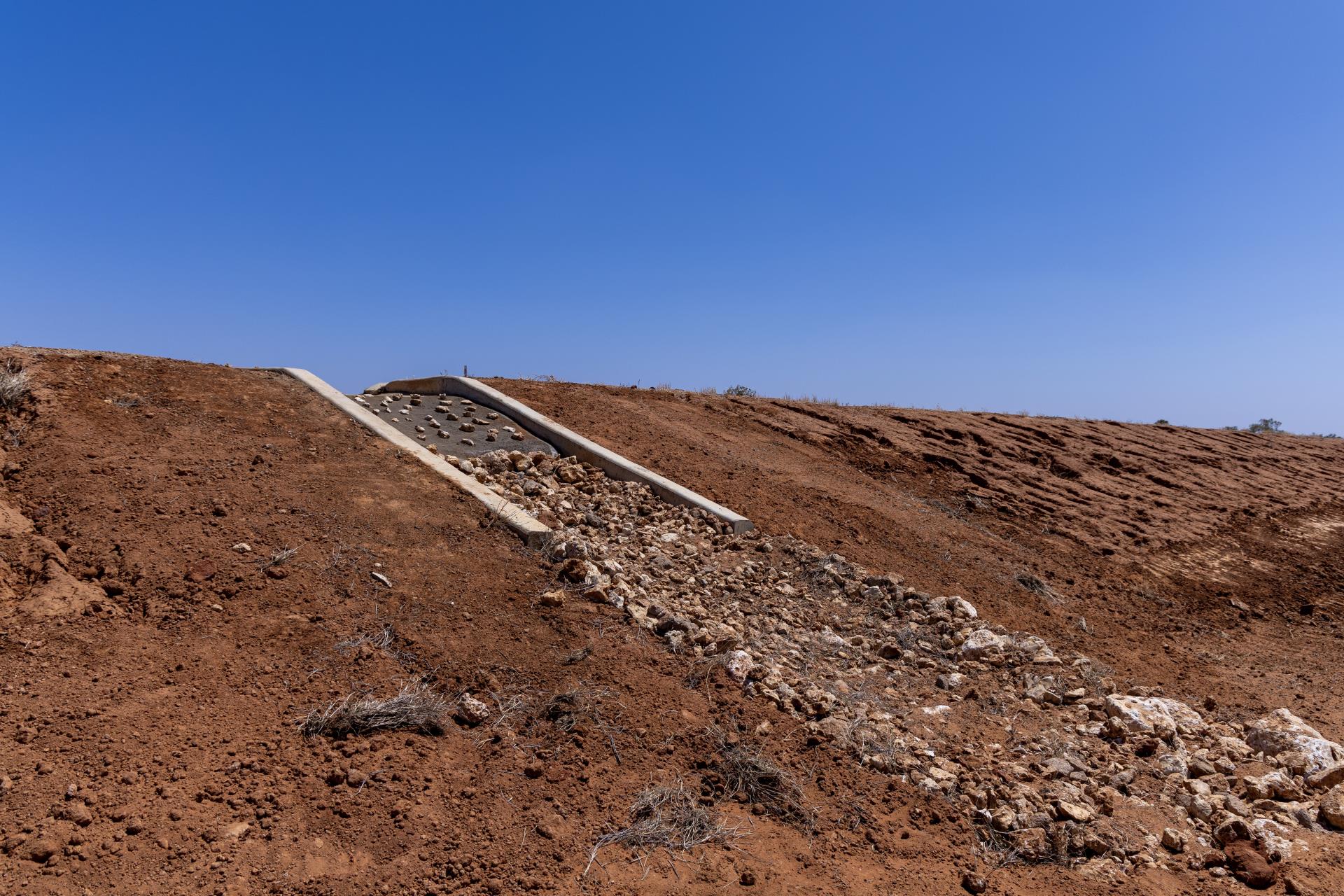 During the annual levee inspection, crews identified a failed rain off-shoot, which had deteriorated following several years of heavy rainfall. To restore the integrity of the levee, the damaged section was excavated down to a solid base and rebuilt using cement-stabilised soil. The off-shoots were also extended further down the slope to reduce the risk of future damage.