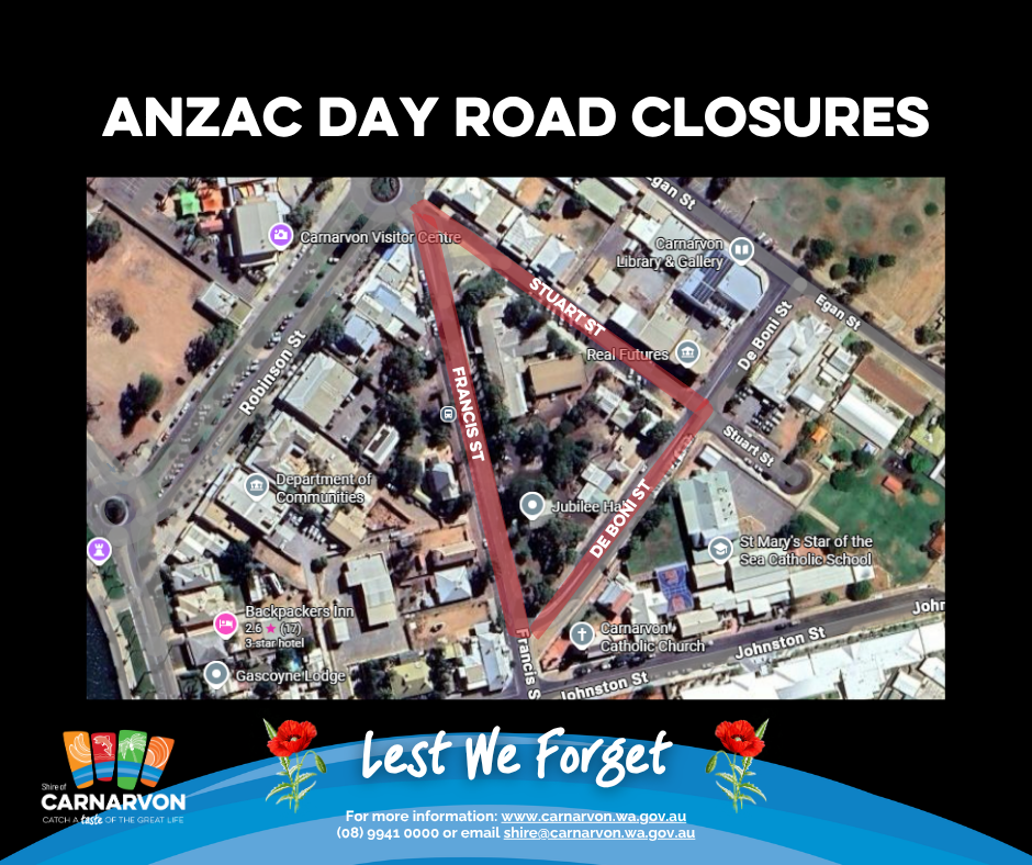 Attendees are kindly asked to arrive by 5:40am, with the service commencing promptly at 5:50am. The following roads will be temporarily closed for the service, so please allow extra time to access the area: