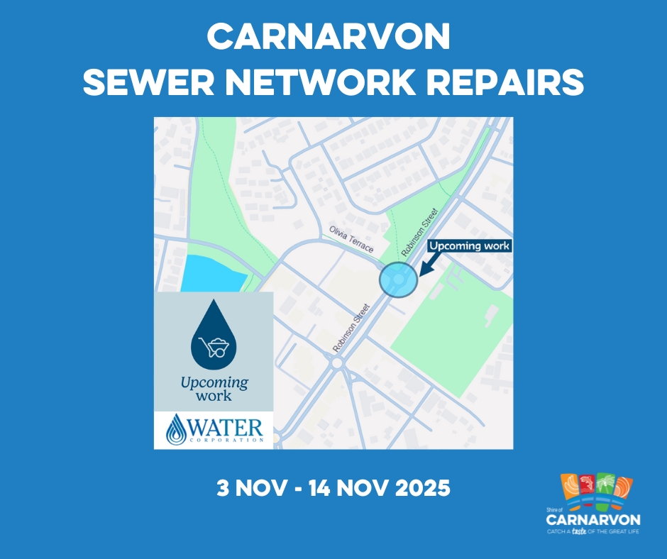 Water Corporation will carry out repairs to the sewer system in Carnarvon, at the roundabout connecting Robinson St to Olivia Tce. This work will commence Monday 6 Nov and take 2 weeks to complete.