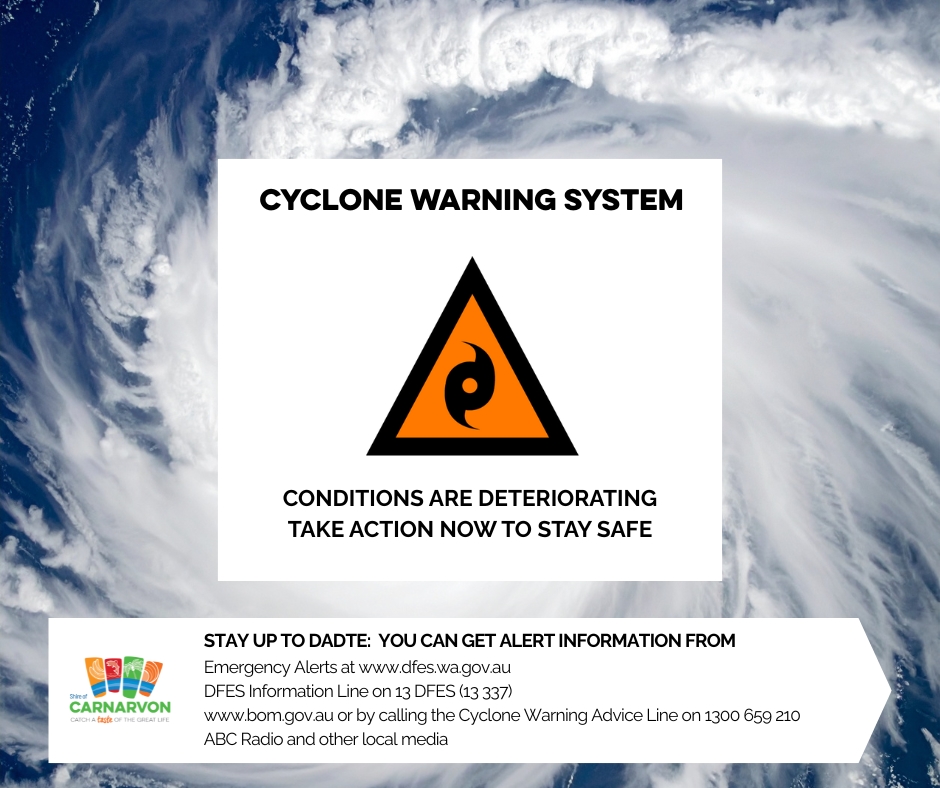 A Cyclone Watch and Act Warning remains in place for areas north of Ningaloo to Carnarvon, including Coral Bay.
