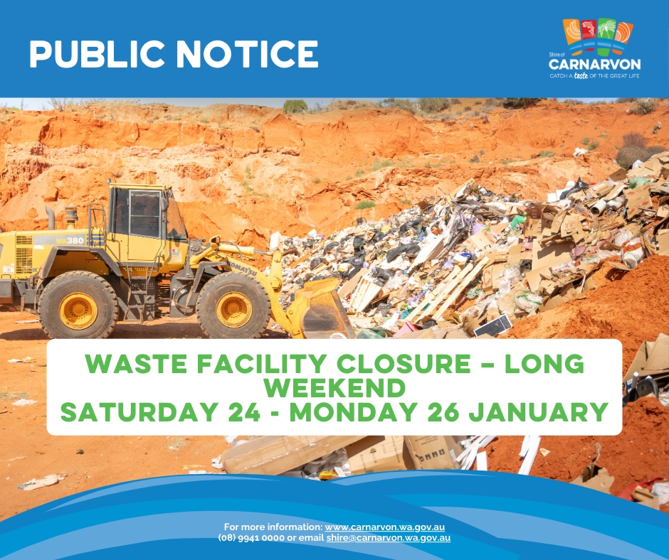 The Shire of Carnarvon advises the community that the Waste Facility will be closed over the upcoming long weekend, from Saturday 24 January to Monday 26 January 2026, inclusive.