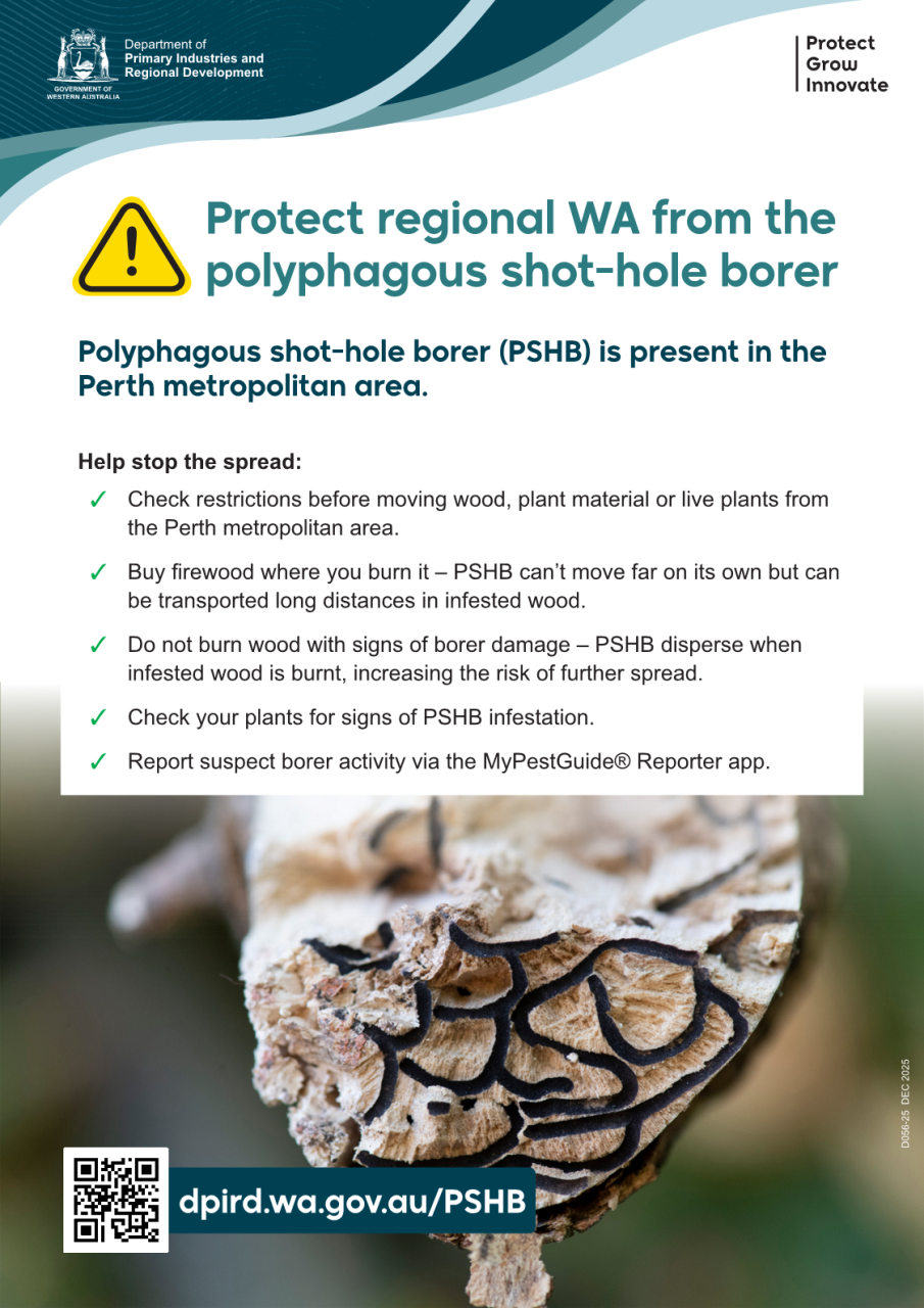 While there have been no detections of PSHB outside the Perth metropolitan area, it is important for everyone to stay vigilant to help protect WA trees.